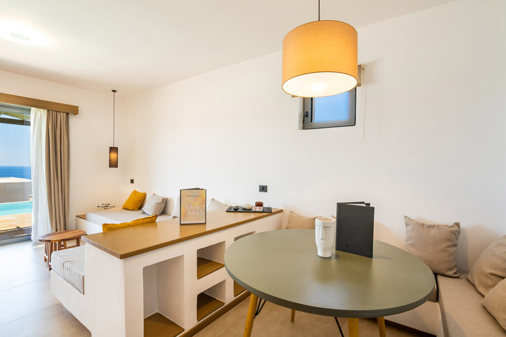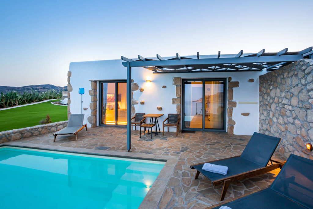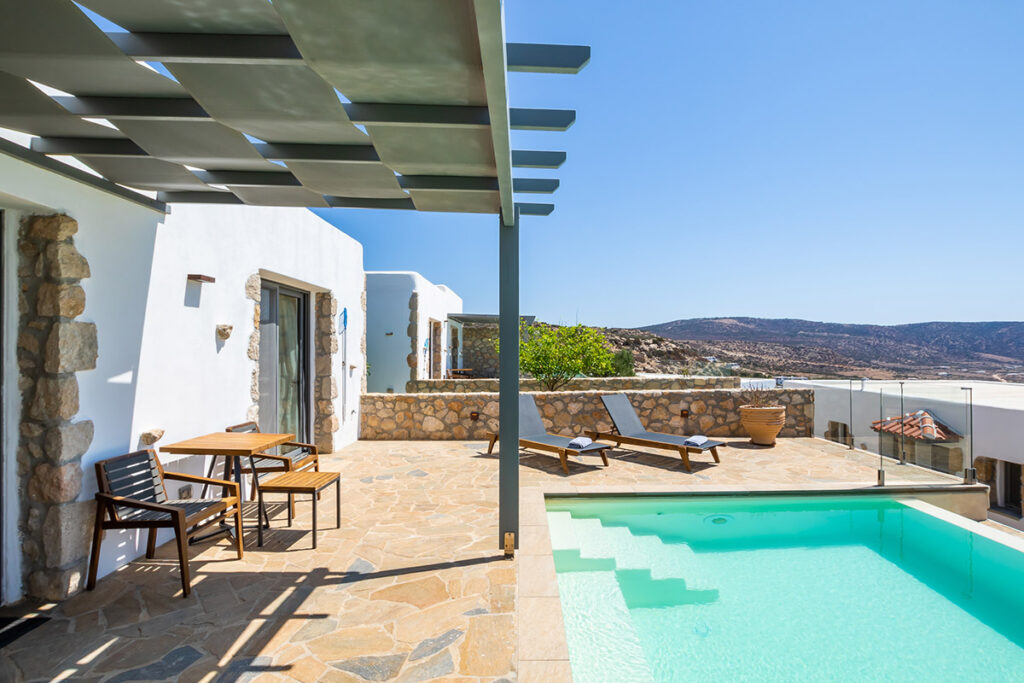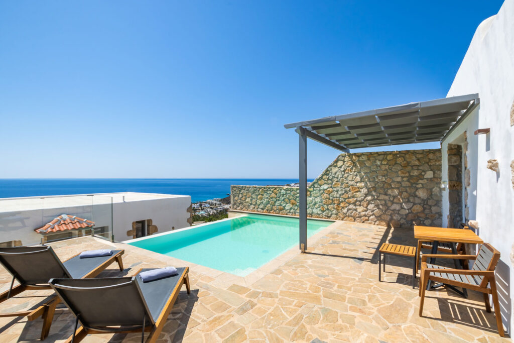 Every suite is thoughtfully designed as an oasis of personal enrichment and relaxation. The architecture of the 20 traditional, stone-built suites merges with the surrounding landscape in perfect harmony. A spacious interior area opens onto a welcoming terrace for outdoor living by a private pool not heated. Discrete furnishings and accessories complement the casual freedom of the Aegean lifestyle, with invigorating sunlight and open sea views.
